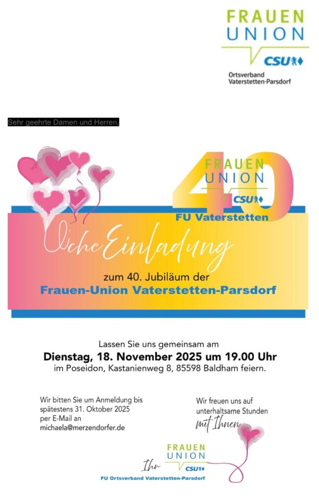 18. November 2025-FU-Treffen- 40 Jahr Feier der Frauenunion Vaterstetten-Parsdorf … Weiterlesen18. November 2025-FU-Treffen- 40 Jahr Feier der Frauenunion Vaterstetten-Parsdorf